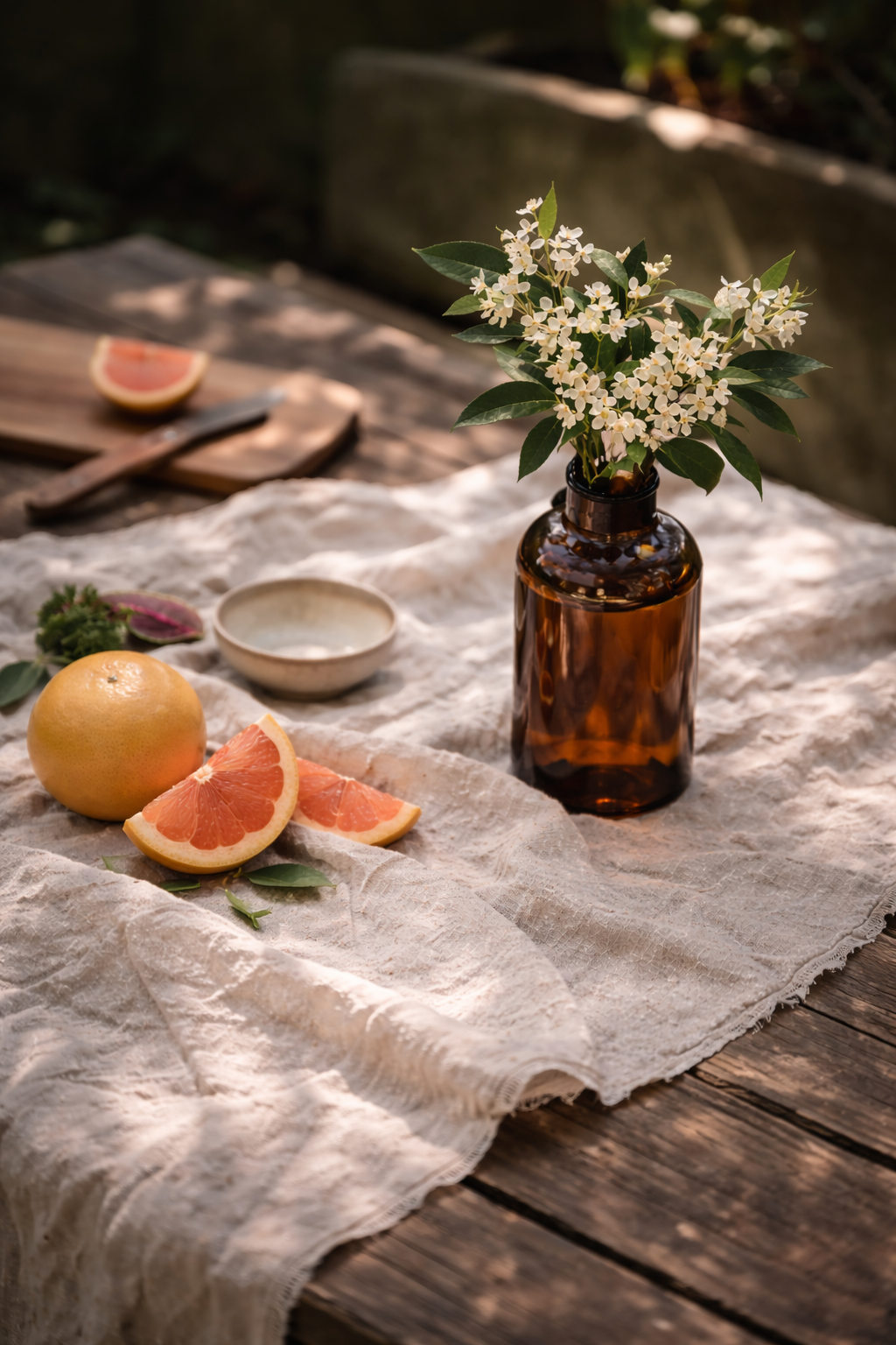 A bright, fruity citrus fragrance bursting with fresh grapefruit, sweet orange, and mandarin. Subtle green floral notes add a soft, natural touch, while a base of musk and patchouli brings gentle warmth and depth.